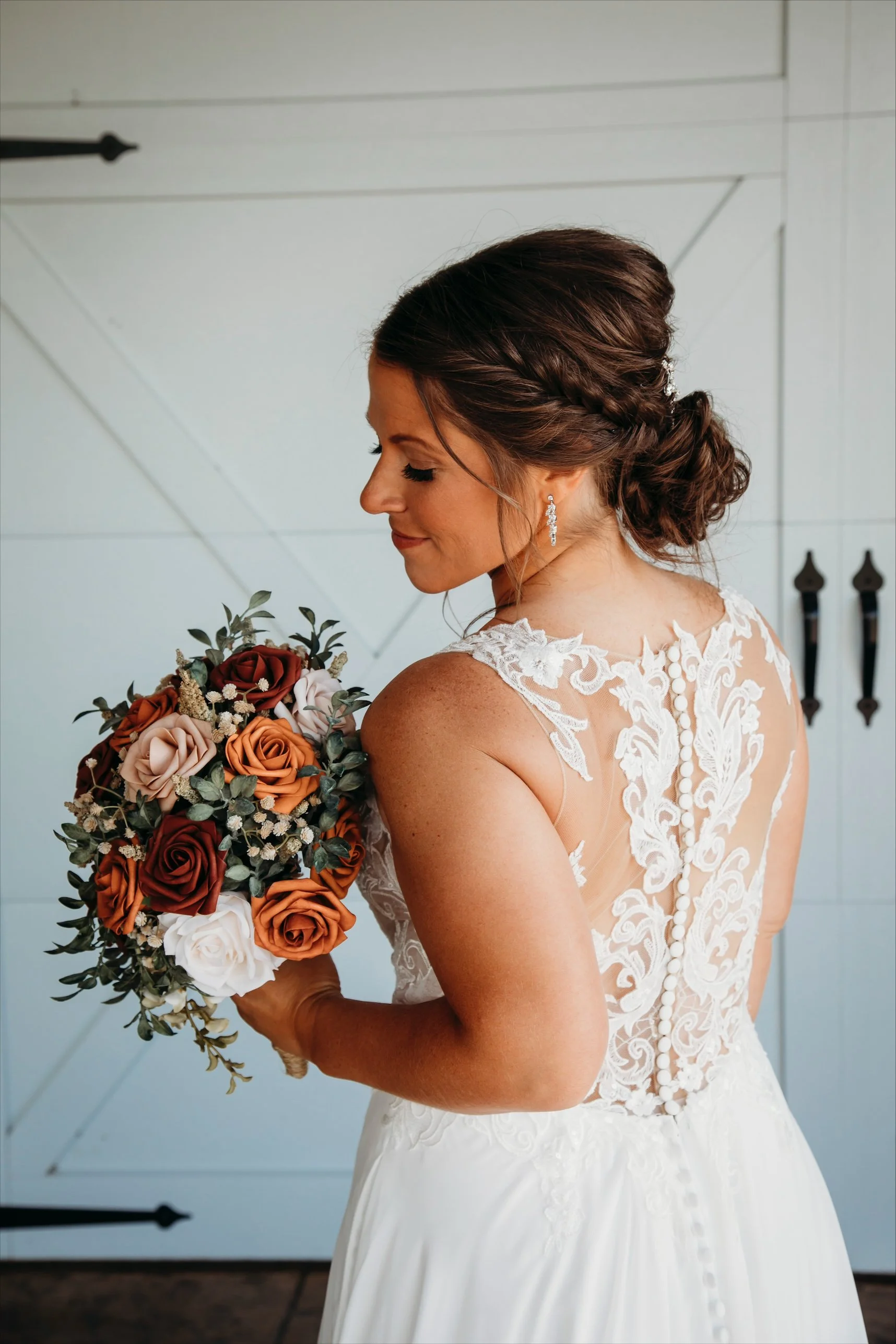 The Dress: Chelsea was a bridal dream in “Ezra” by Piper Jay (a private line exclusive to Memories). Ezra is fun and flowy, perfect for an breezy outdoor wedding. The back is a head-turner, with illusion lace and button’s from top to bottom. The chiffon skirt flows into lace, giving Chelsea’s dress a little extra spunk! From head to toe, Chelsea was a beautiful bride!