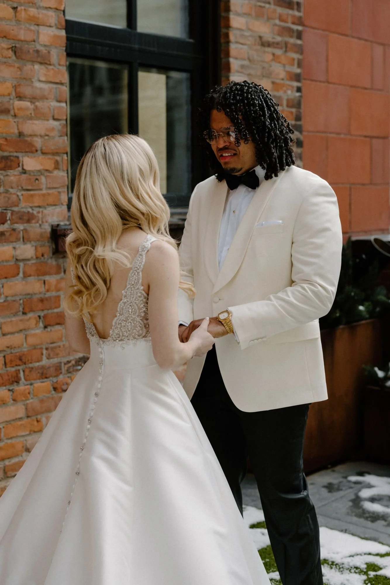 The Dress: Angela was a glowing bride, wearing not one, but two Memories bridal gowns! The first is a classic a-line “Camryn” by Justin Alexander. The second is a fitted all over lace gown “Tuscany Lynette” by Maggie Sottero. Thank you for being a Memories Bride, Angela!