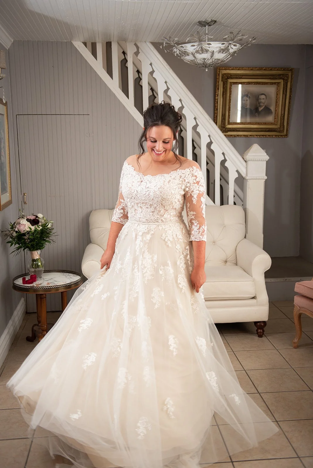 The Dress: Lauren is a gorgeous bride in “Bree” by Maggie Sottero. “Bree” is absolutely dreamy with romantic lace motifs that cascade over tulle in this illusion, off-the-shoulder, a-line wedding dress. The illusion portrait neckline and illusion half-sleeves draw attention to Lauren’s glowing “in love” smile. Thank you Lauren for being a Memories Bride!