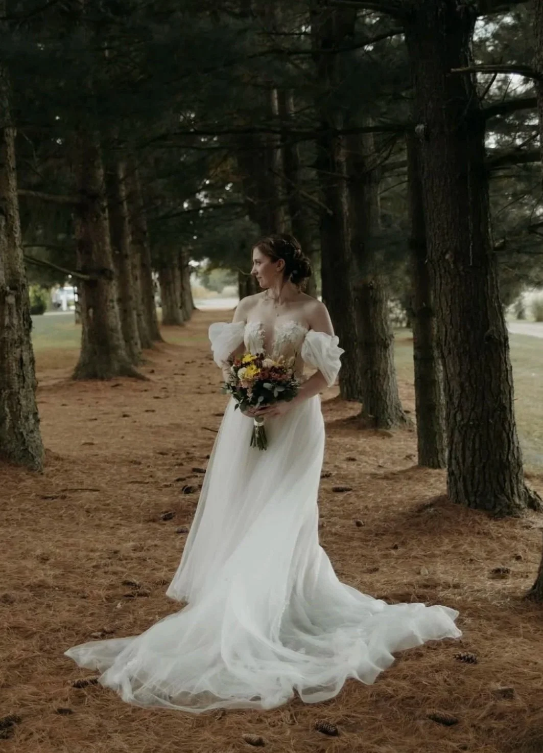 The Dress: Amber was an absolute dream in her Chic Nostalgia “Dior” gown — a romantic, ethereal design that seemed made just for her. The corseted bodice, adorned with delicate 3D florals and airy off-the-shoulder tulle, created the perfect blend of whimsy and grace. Every detail flowed effortlessly with her warm, natural style and the beauty of her outdoor setting. Amber, thank you for being a Memories Bride! We’re so honored to have been part of your timeless celebration of love.