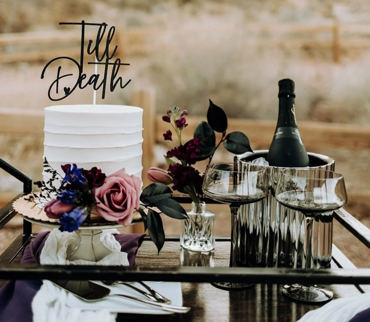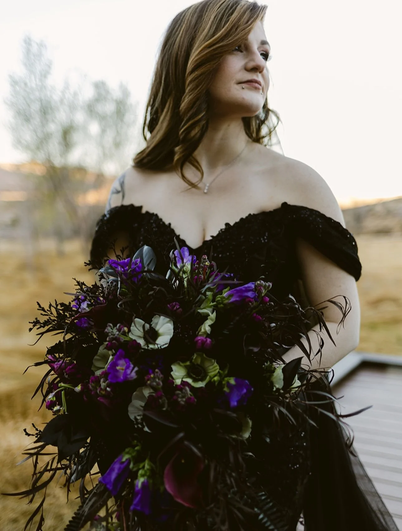 The Dress: For her wedding in the stunning Red Rock Canyon, Emily chose the unforgettable EW36010 gown by Ellie Wilde—and it couldn’t have been a more perfect fit. With its off-the-shoulder neckline, shimmering detail, and dramatic train, the gown brought a modern twist to her romantic desert celebration. The sleek black silhouette paired with a vibrant bouquet made for a look that was effortlessly cool, elegant, and totally her. From the views to the vows, every detail of the day felt as one-of-a-kind as the bride herself.