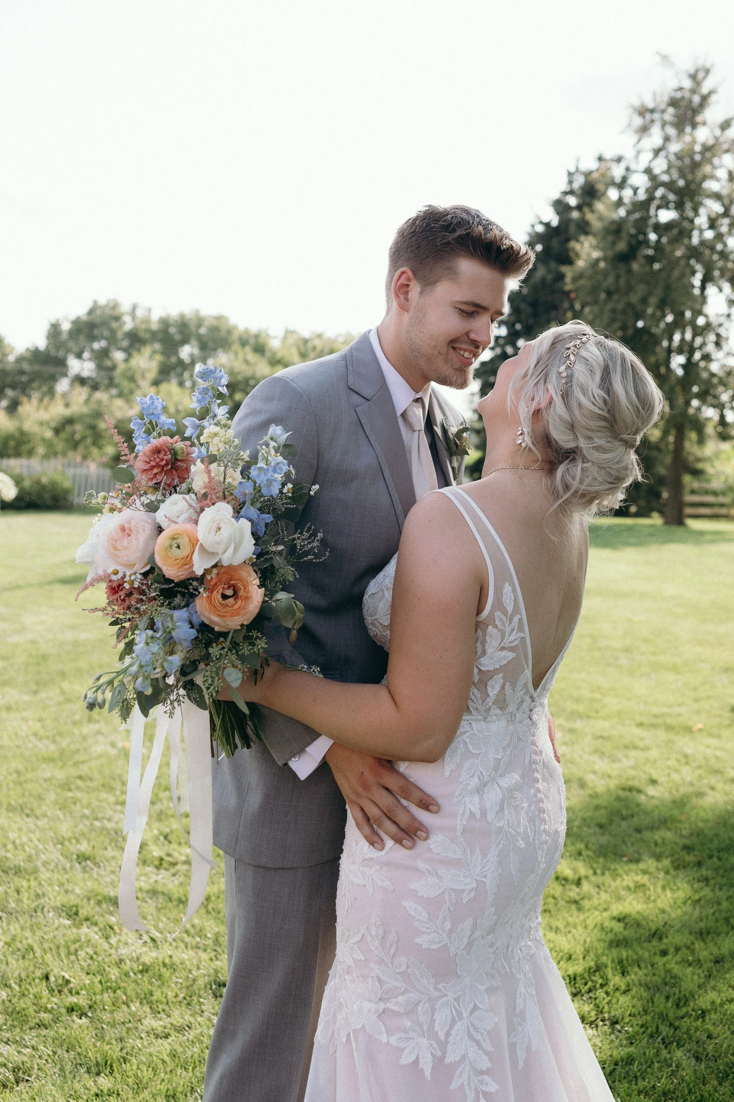 The Dress: Reanna's bridal gown, “Scarlett” by Piper Jay, is a blend of timeless romance and modern elegance. The blush undertone highlights the intricate ivory lace appliqué, creating a soft contrast. Floral motifs gracefully adorn the bodice and skirt, adding a natural charm. The plunging V-neckline and open back offer a balance of sophistication and allure, while the soft tulle skirt flows effortlessly, catching the light with every step. This gown perfectly complements Reanna's romantic style, making her a breathtaking vision on her special day.